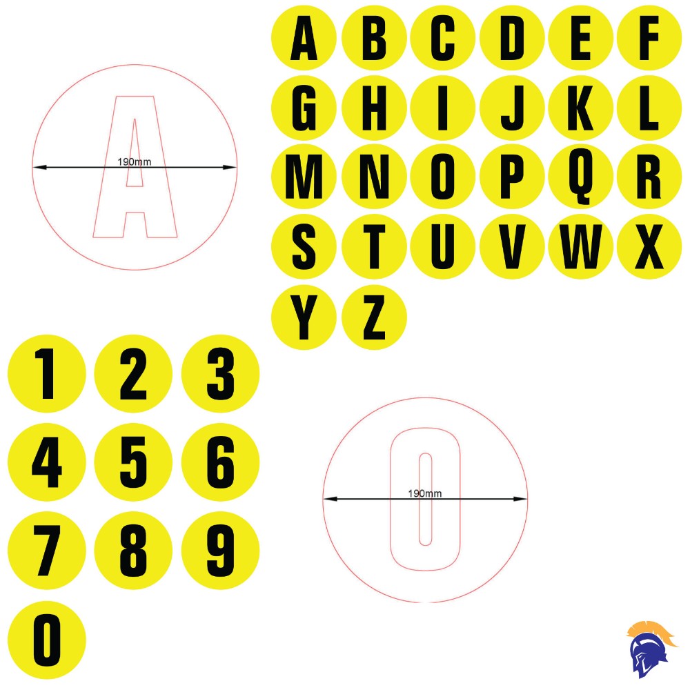 These markers are 190mm diameter in size and are printed with a bold black font on a yellow background.